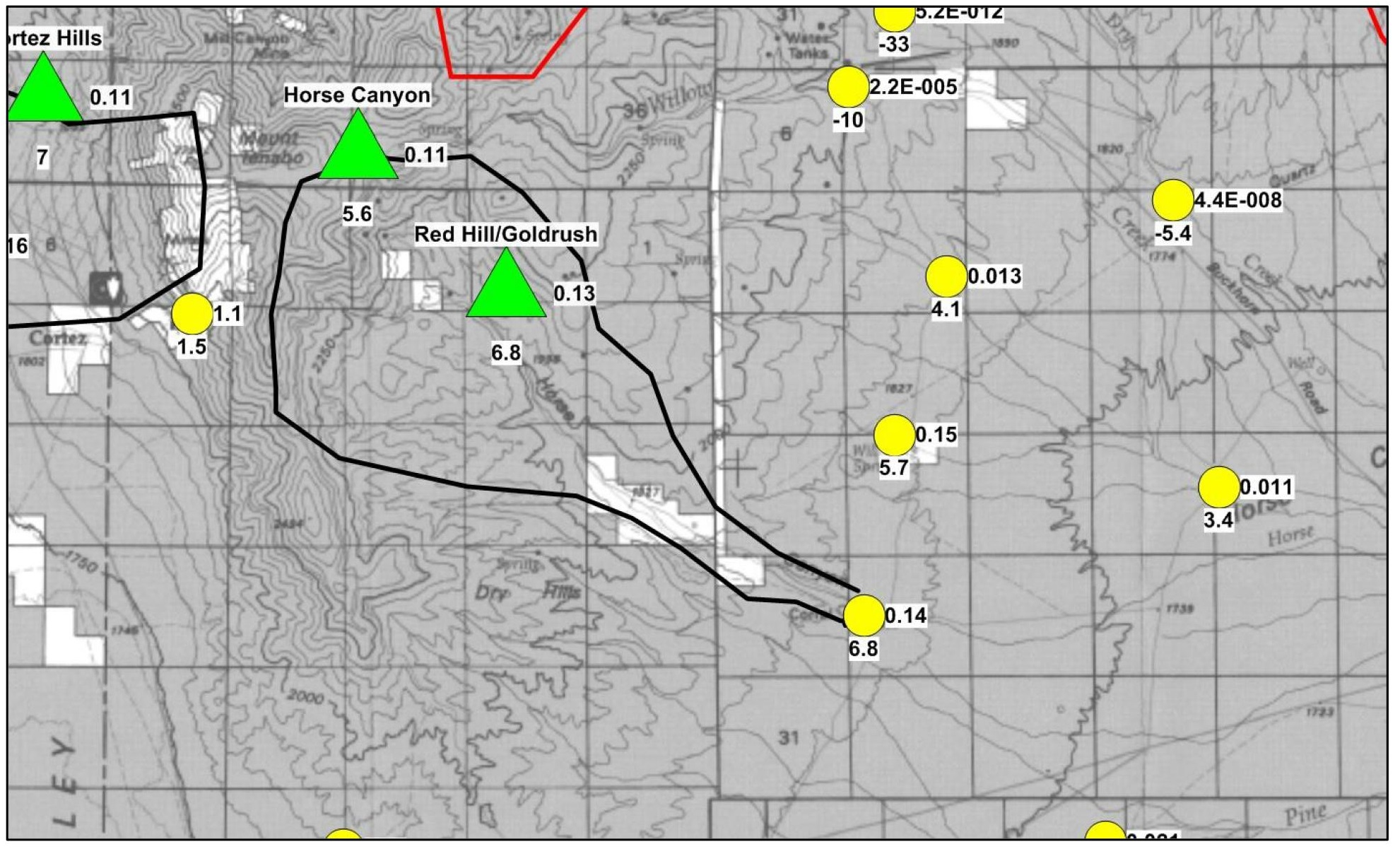 | A retrospective map demonstration of the ability of the new applied exploration technology to 'de-risk' exploration expenditures in time and money -- and to maximize eventual mining returns: A geochemical reconnaissance stream sediment sample map of the ~7 square mile drainage cell area in Nevada containing Barrick's Barrick’s 2004 Red Hill/Goldrush Carlin-type gold deposit discovery. The yellow circles represent the locations of stream sediment samples taken during the US 1975-1980 NURE geochemical program -- at least 24 years before Barrick made its gold deposit discovery. Numbers on the bottom of each yellow stream sediment location symbol are the log10 gold resource troy ounces predicted using the method under discussion, while the numbers to the right are the similarly predicted average ore grades in troy oz/ton. Green triangles are the locations of the known gold deposits in the area, with log10 resources below and average ore grades to the right. Note: 1) the close match between Red Hill/Goldrush reserves and grade figures and those calculated from the NURE sample taken at the end of the Horse Canyon wash; and 2) the much lower calculated resource and grade figures from stream sediment samples peripheral to the location of the discovery stream sediment sample. |